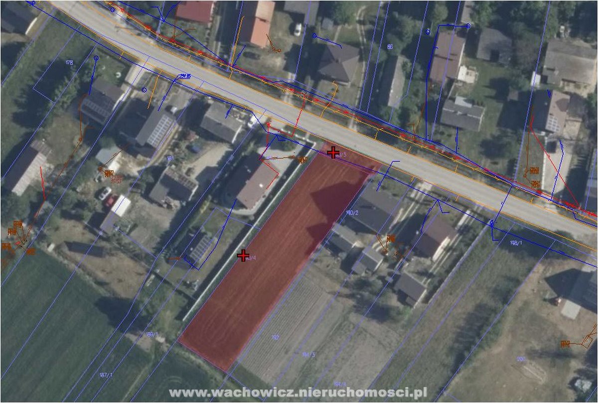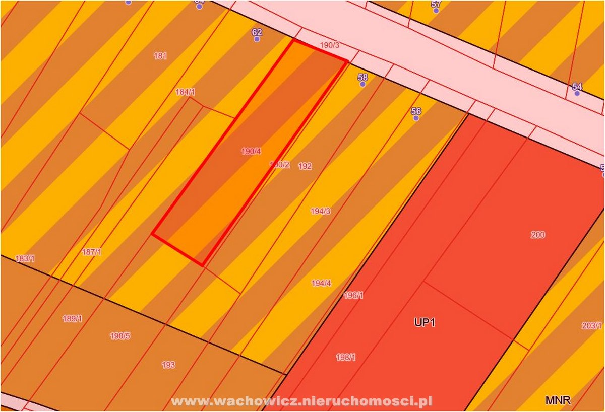 Działka ma kształt prostokąta, powierzchnię 13,6 ar, szerokość 18m i długość 80m.
