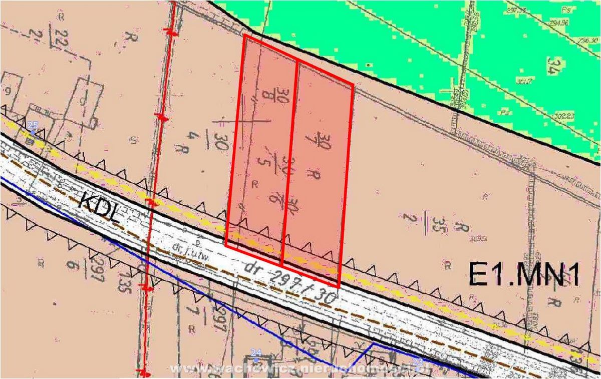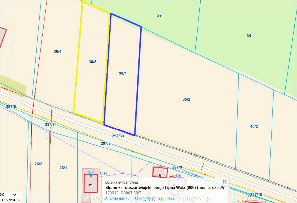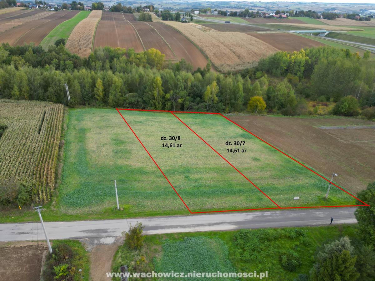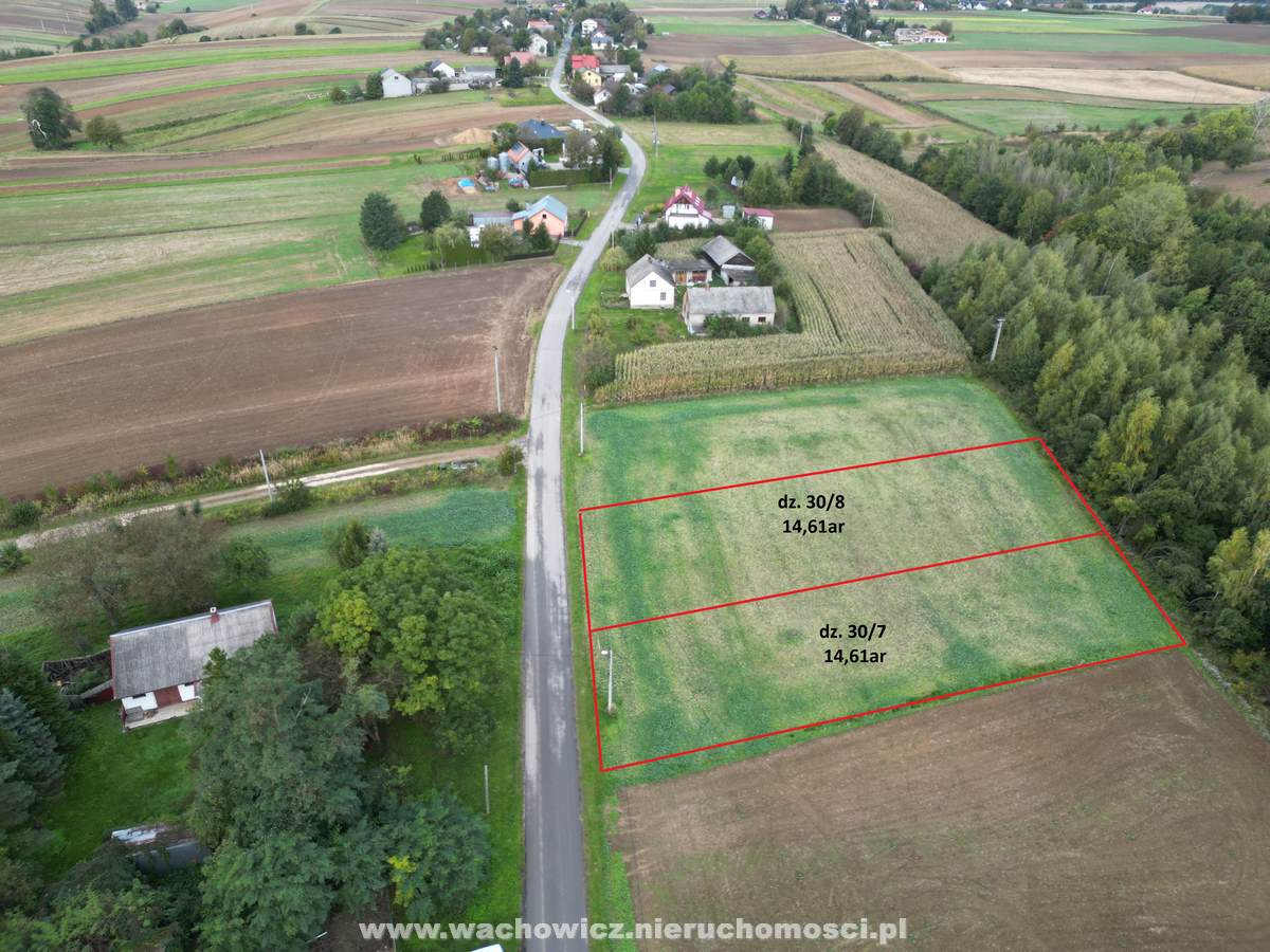 Działki mają numery geodezyjne 30/7 i 30/8, obie mają powierzchnie 14,61 ar, kształt zbliżony do prostokąta o wymiarze 20m x 273m.